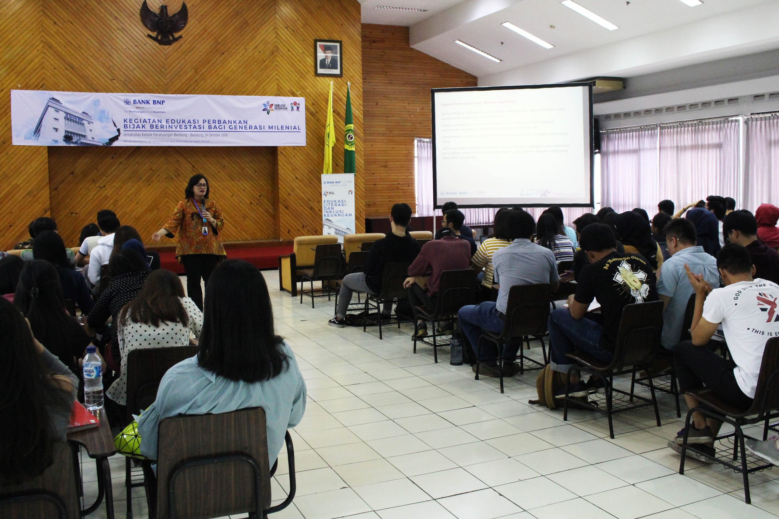Bekerja sama dengan Bank Nusantara Parahyangan (BNP), Program Studi Sarjana Manajemen UNPAR menggelar kuliah umum bertajuk “Pengenalan Program Anti Pencucian Uang dan Pencegahan Pendanaan Terorisme di Kalangan Generasi Muda”. Kuliah umum ini digelar di Aula Lantai 8 Gedung 9 Fakultas Ekonomi UNPAR pada Rabu (24/10) lalu.