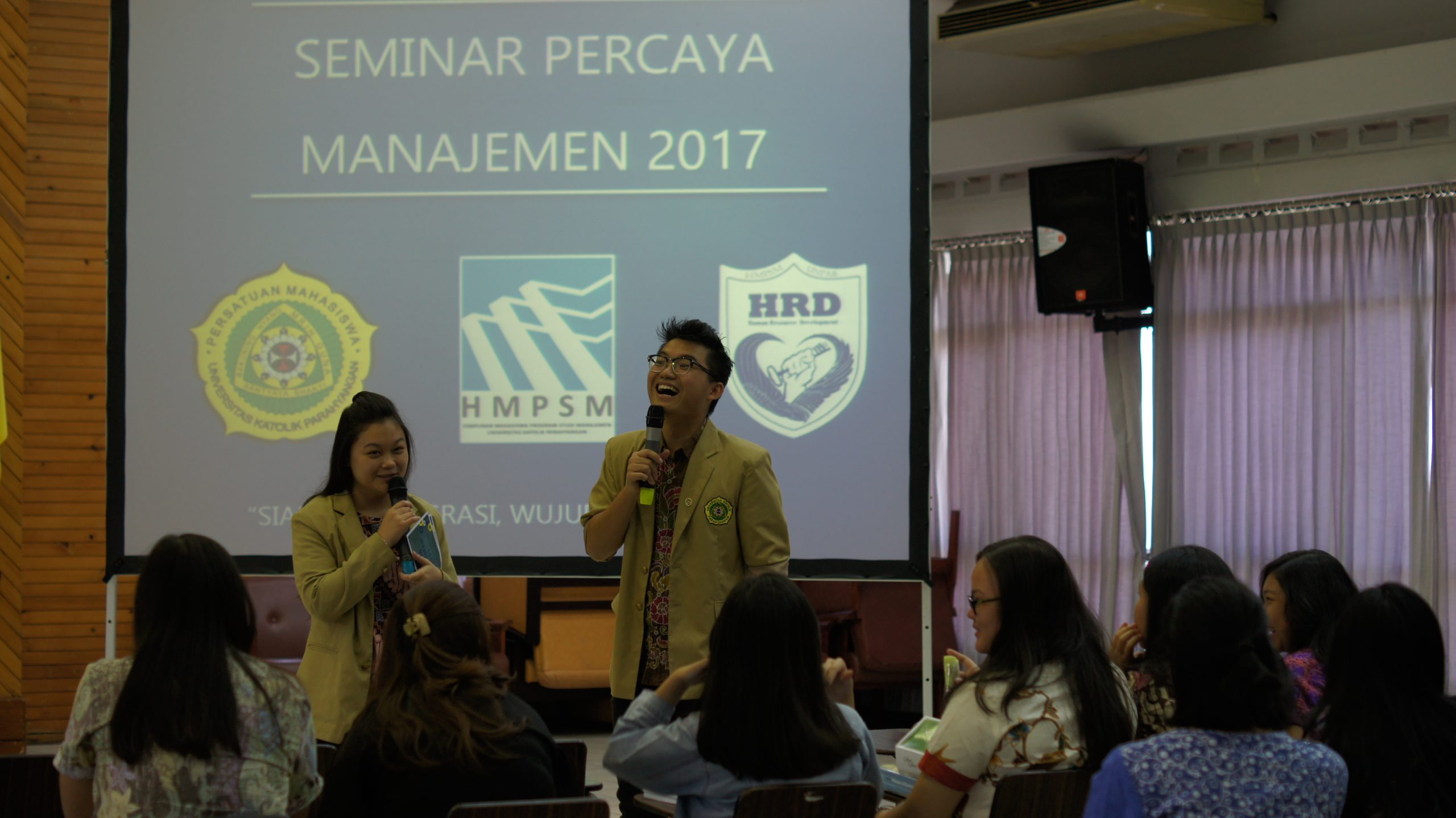 Kegiatan Percaya Manajamen 2017 telah dilaksanakan pada tanggal 19 September 2017 di Aula gedung 9 Fakultas Ekonomi Universitas Katolik Parahyangan. Panitia dari Percaya Manajemen 2017 sudah berkumpul dari pukul 09.30 WIB untuk melakukan checksound dan briefing. Lalu, kegiatan ini dimulai (open gate) pukul 10.30 WIB. Kegiatan ini dibuka dengan pendataan dan pemberian snack kepada peserta yang dilakukan oleh divisi publikasi serta ada sambutan dari MC untuk peserta yang telah memasuki ruangan.