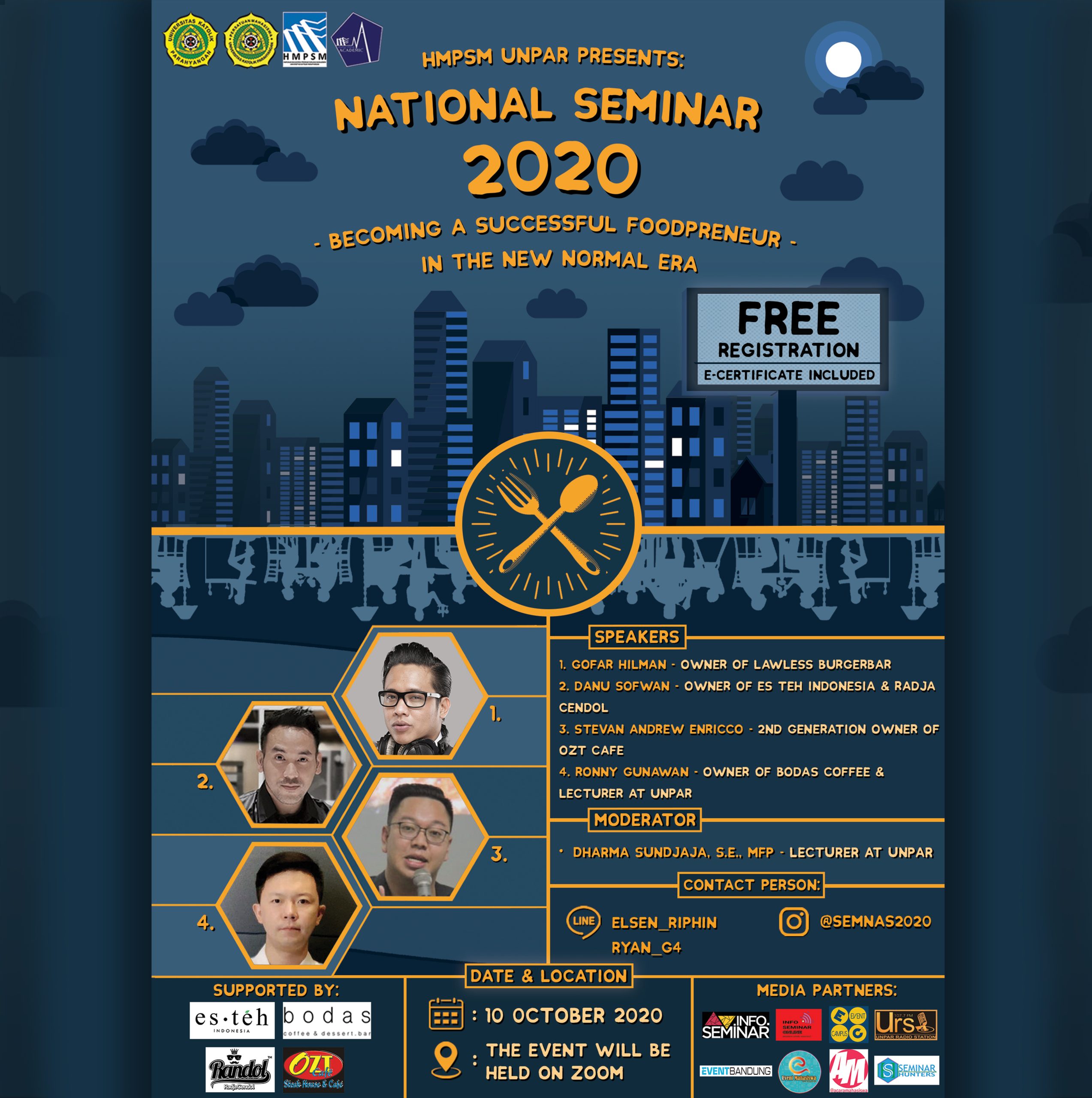Seminar Nasional 2020 dilaksanakan secara online pada Sabtu, 10 Oktober 2020 pukul 12.30 – 16.30 WIB. Dimulai dengan kegiatan seminar yang membawakan tema “Becoming a Successful Foodpreneur in The New Normal Era”. Tema ini diambil karena melihat bahwa banyaknya minat berbagai kalanganuntuk terjun ke dalam bisnis kuliner dan menjadi seorang foodpreneur, terutama pada masa pandemi Covid-19 dengan memanfaatkan teknologi yang ada. Akan tetapi dengan banyaknya pengusaha yang terjun ke dalam bisnis kuliner serta berbagai tantangan baru pada masa pandemi ini, menyebabkan bisnis kuliner pada akhirnya tidak bisa bertahan.